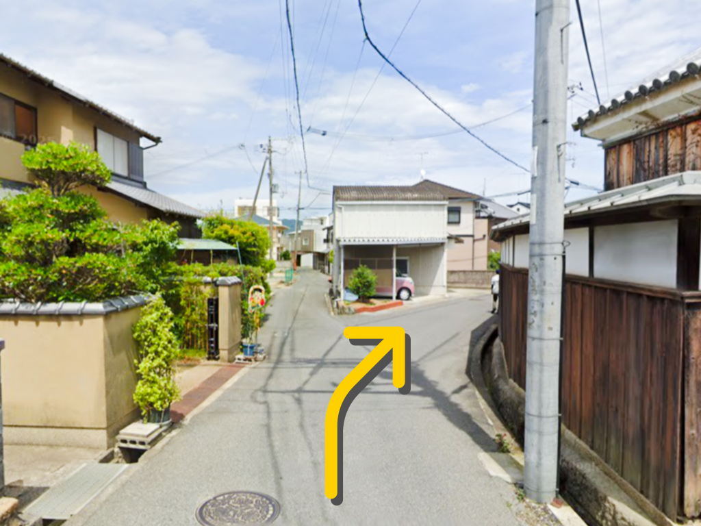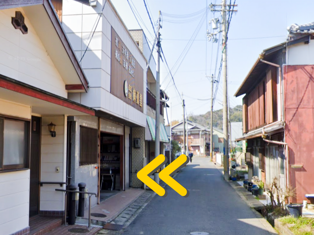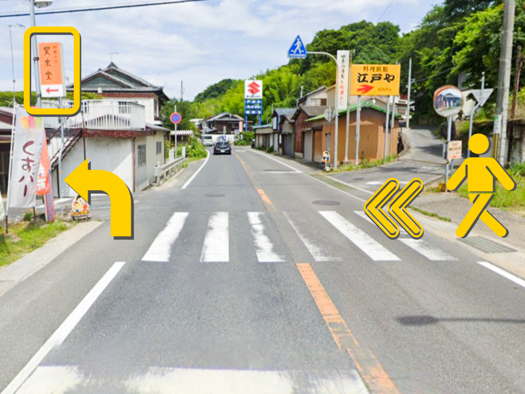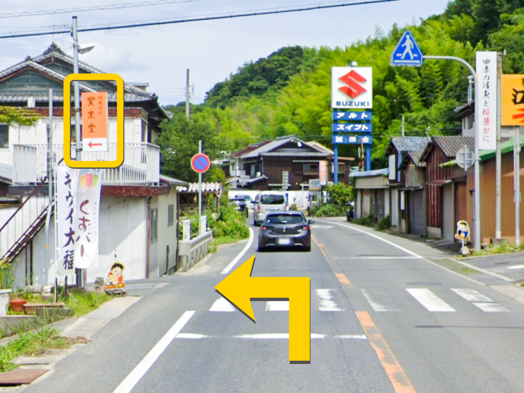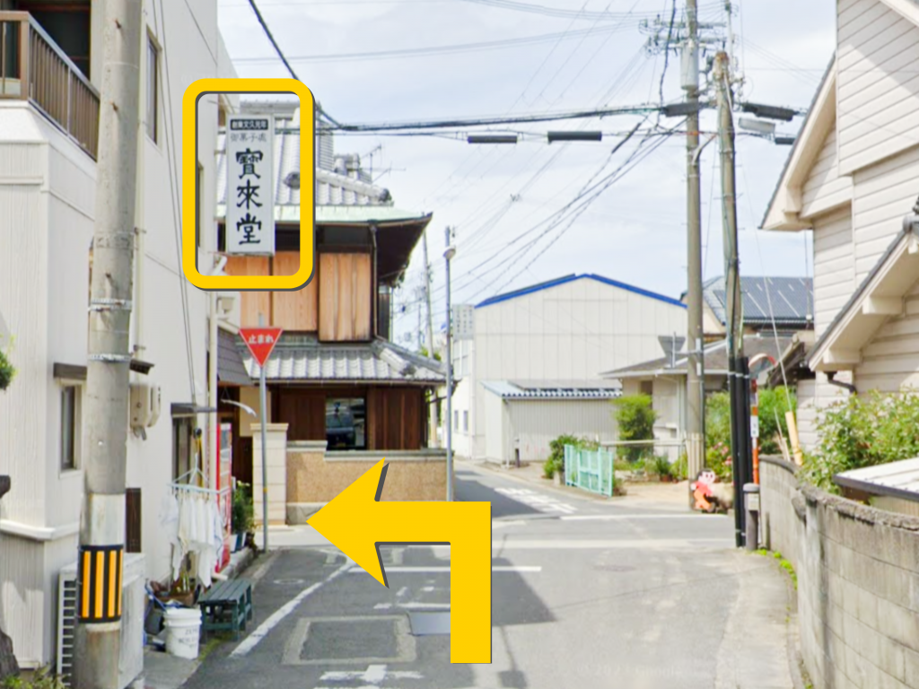 ② 「寳來堂」さんのお店の角(止まれ)を左折します。(ここも道幅が狭いのでご注意ください)