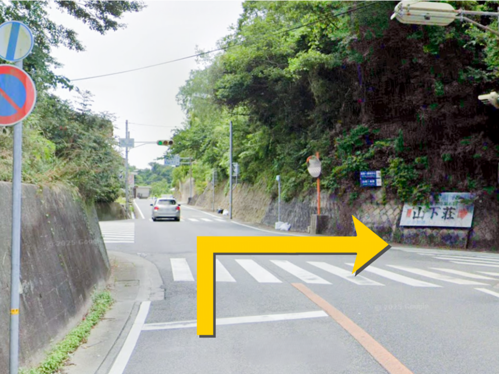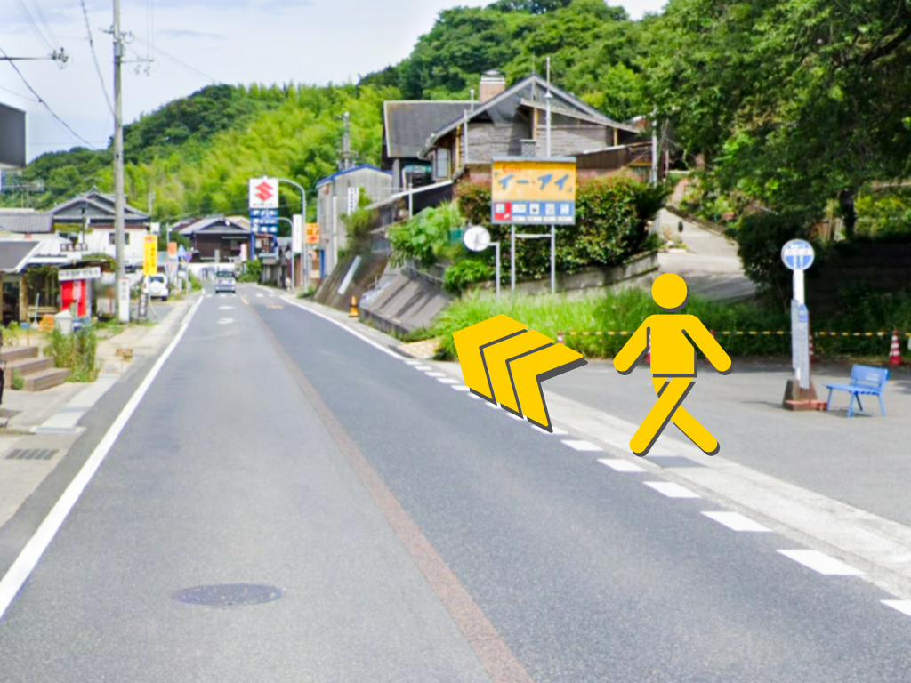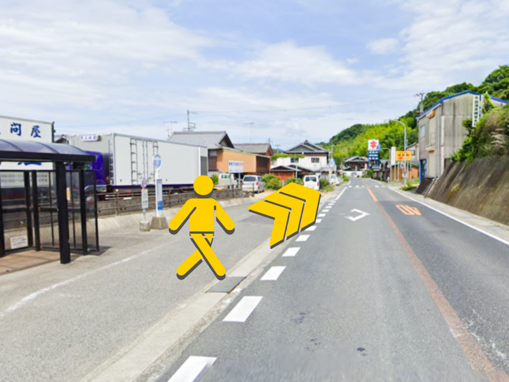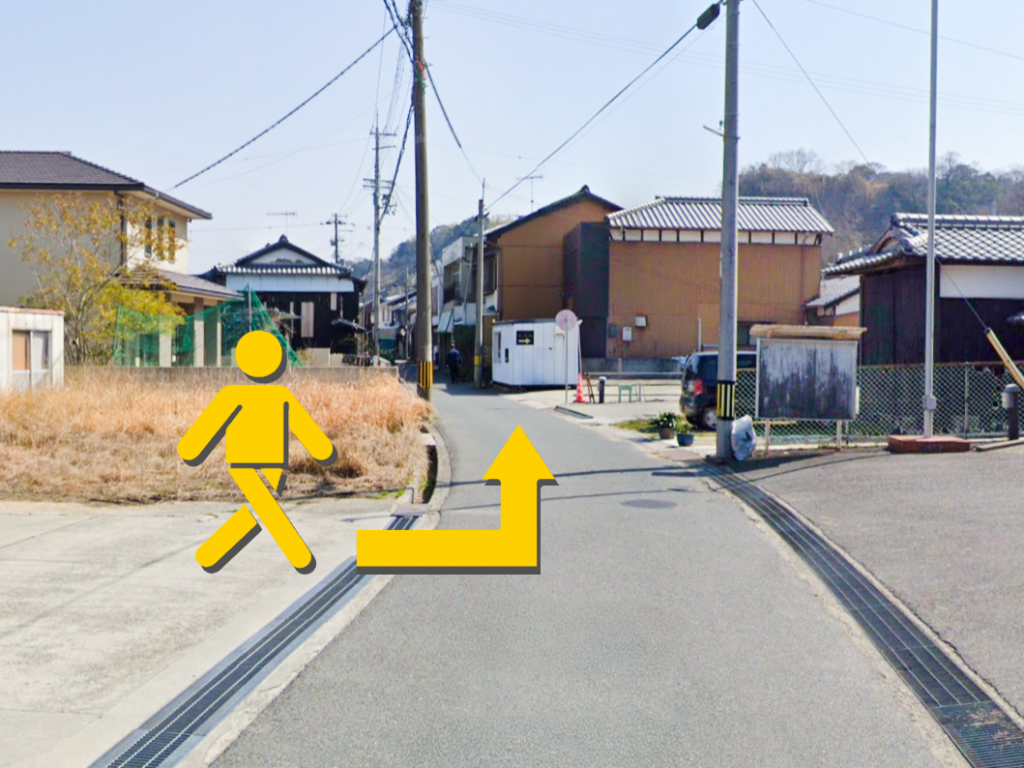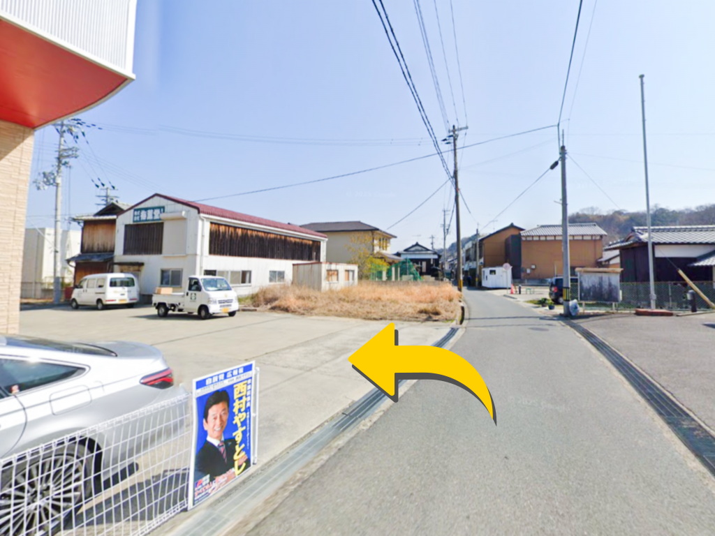 ⑨ 敷地から県道に出て左(東側)に進みます。