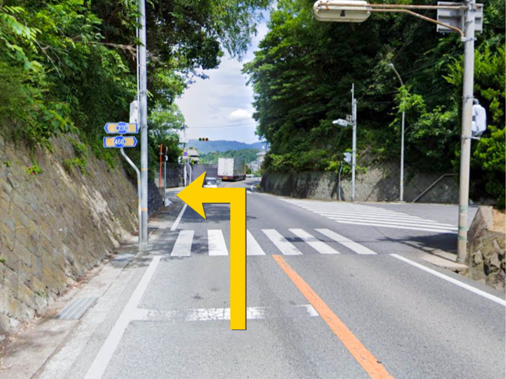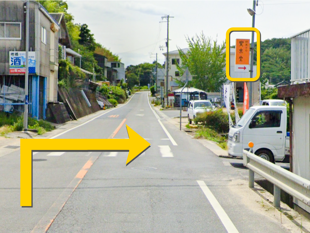 ② 淡路サンセットライン(県道31号線)から中道に入ります。和菓子屋「寳來堂」さんの看板が目印。反対車線からは必ず横断歩道を渡ってください。