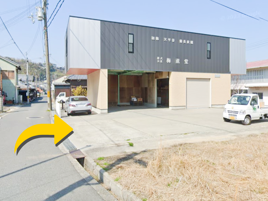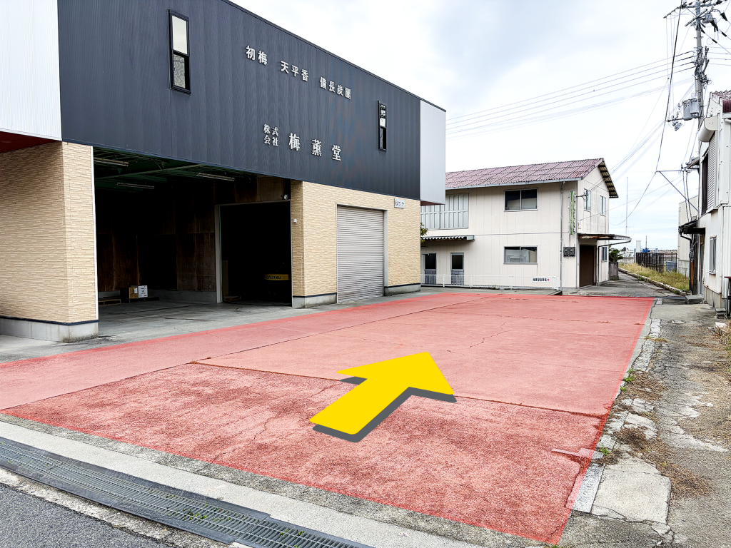 ⑤ 梅薫堂の配送センター(2階が灰色の倉庫)が見えたら、倉庫の正面まで進みます。