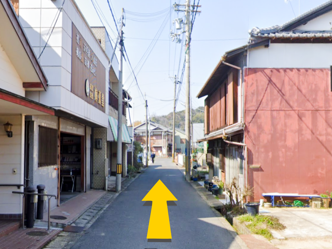 ① 淡路サンセットライン(県道31号線)から中道に入ります。和菓子屋「寳來堂」さんの看板が目印。(道幅が狭いのでご注意ください)