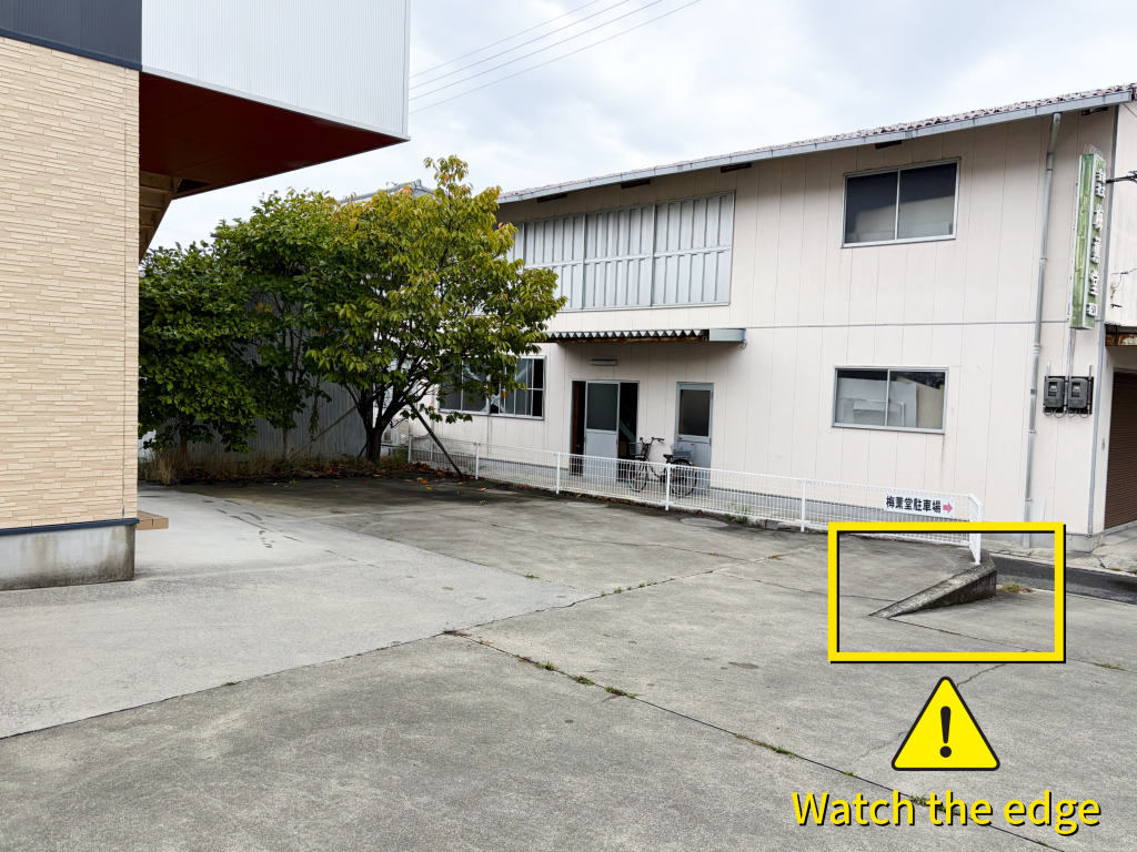 5. Please proceed to the rear of the warehouse. Be careful, as pedestrians may come out from the back area. Please refrain from parking inside the warehouse or in front of it (red-marked area).